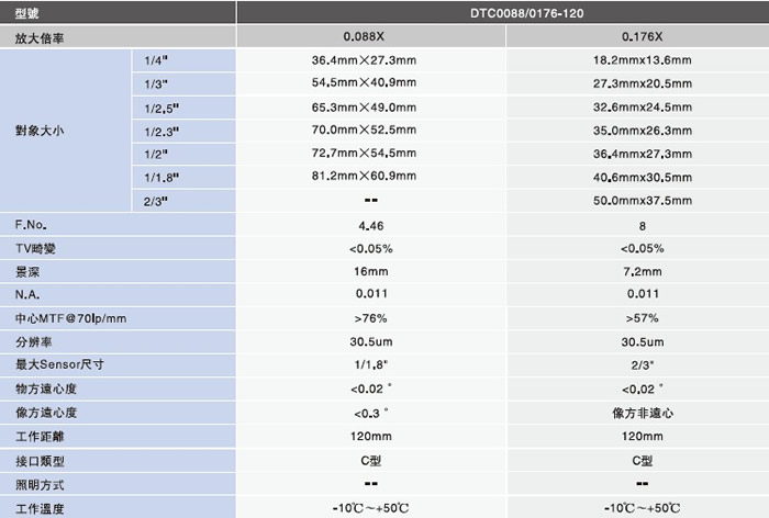 SEIKO DTC0088/0176-120双倍双远心镜头参数: